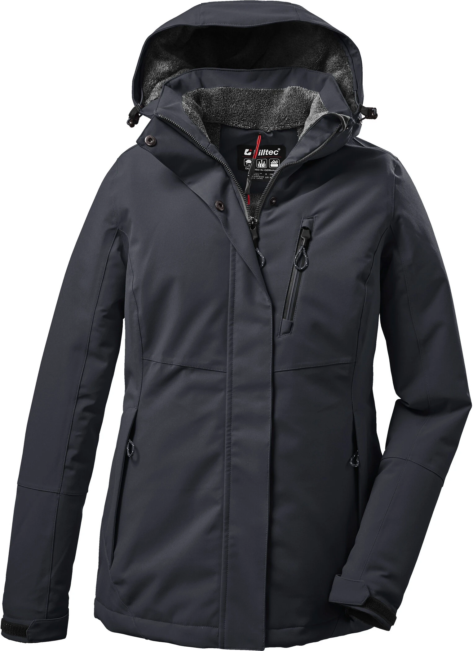 The women’s functional jacket by killtec impresses with its timeless design and reliable functionality. With a 10,000 mm water column and taped seams, the jacket is 100% waterproof and windproof. In addition, it is breathable with a 3,000 g/m²/24 h water vapour permeability. The hood is individually adjustable and can be removed if necessary. The cuffs are adjustable with Velcro fasteners. The hood and collar are softly lined with cuddly teddy fleece and provide protection in adverse weather. Numerous pockets offer enough storage space for mobile phone, keys and other important things. The concealed zip is equipped with a practical chin guard. This jacket is PFC-free.