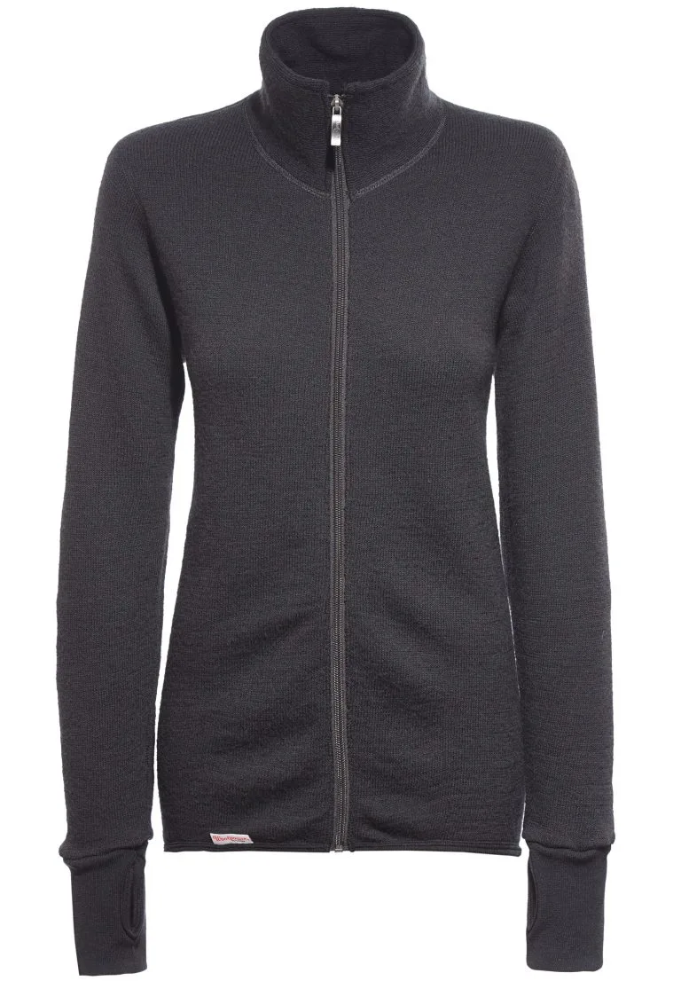 Full zip jacket has a high collar, cuffs with thumb holes and a full length zipper. It is made of circular knit fabric with terry loops. The back is longer to prevent gaps. The collar has the Woolpower logo knitted in.